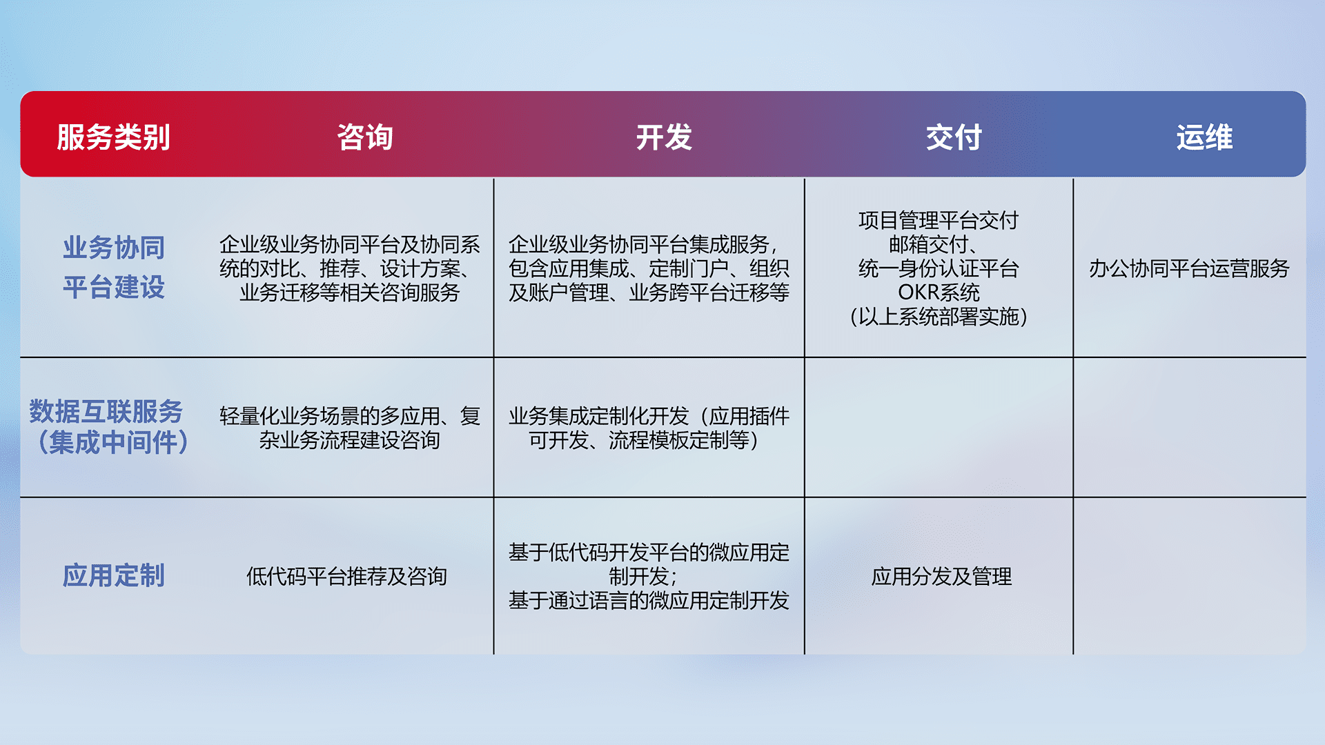 针对钉钉、、、、企微、、、IDaas等平台级产品提供产品的规划、、、方案、、交付、、定制化开发等服务,,,实现如统一协同办公、、智能客户服务、、、、混合会议管理、、、智能数据查询、、、等业务场景,,,,实现数字化转型。。