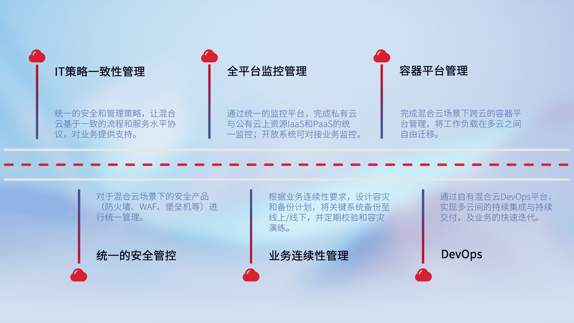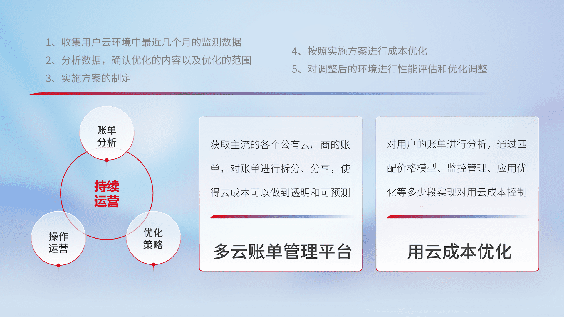 通过多云纳管,,,以统一的资源数据模型把客户的云资源进行抽象和封装,,进而实现对多云资源的统一操作,,,保障云资源管理的可靠性、、、稳定性与可用性。。量身定制化运维内容,,配置、、开发运维、、补丁管理、、、备份、、、、监控、、认证和访问管理、、、审计和日常巡检等,,保障在用云过程中的可靠度,,稳定度以及高可用率。。